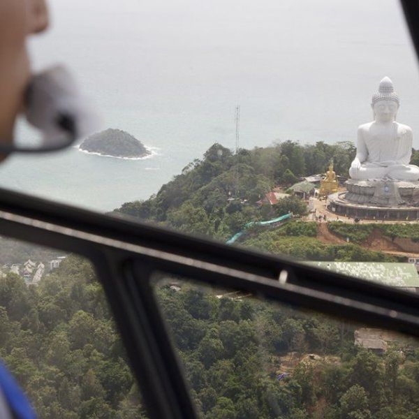 Skydance Heliport – National Park Nai Thon – Bang Tao 5-Star Laguna – Millionaires’ Mile, Phuket’s Dream Villas – Sin City Patong – Kata & Karon Beach – Dramatic Prom Thep Cape: Phuket’s southernmost point – circling around the 46m high Big Buddha – famous Chalong Temple – Red Mountain: a former tin mine turned into a golf course – Skydance Heliport